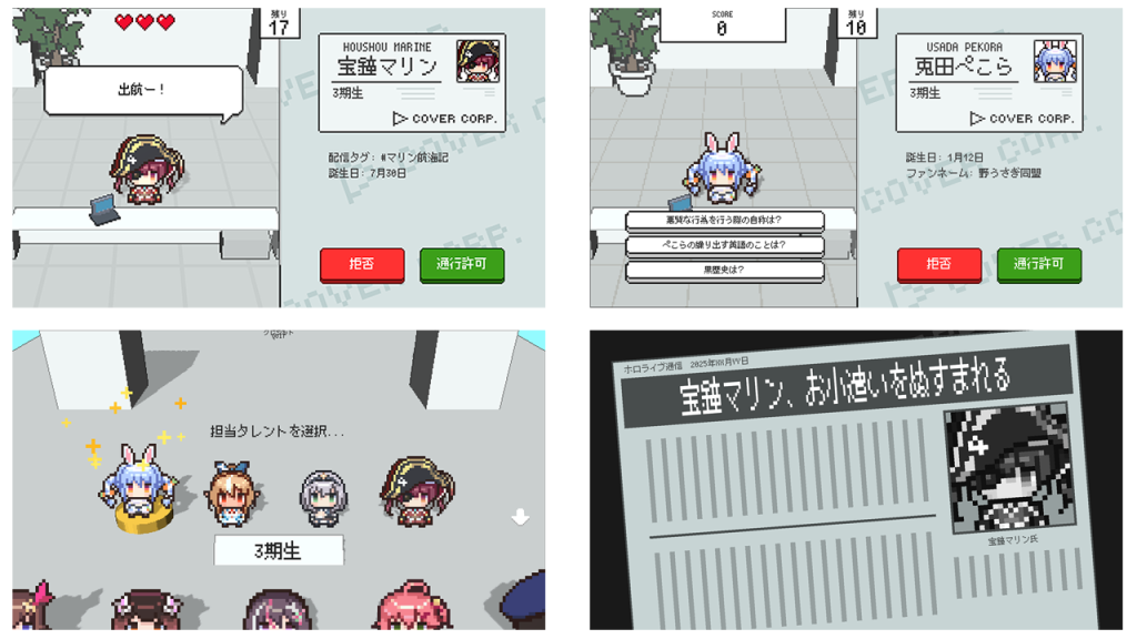 出勤してきたホロライブタレントのIDカード、プロフィールに間違いが無いか、時には簡単なヒアリングを行いタレントが「ホンモノ」か「ニセモノ」かを見分けて、通行許可か拒否の判断をしよう!