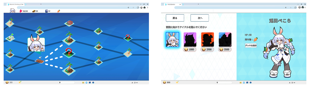冒険するタレントは初期キャラクターとして「兎田ぺこら」が選択可能です。