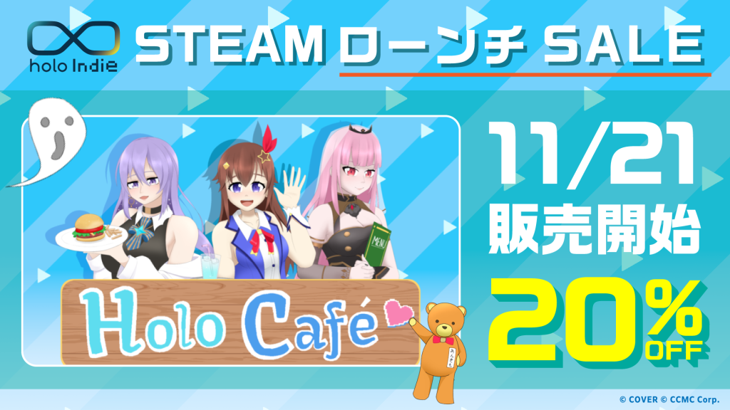 株式会社シー・シー・エム・シー(CCMC)は、同社が運営するホロライブプロダクションの二次創作ゲームブランド「holo Indie(ホロインディー)」上で、個人クリエイターの「Kevinfu510」氏が開発したカフェ経営シミュレーションゲーム『HoloCafe』の販売をSteamで開始したことをお知らせいたします。あわせて「20%OFF」でお買い求めいただけるローンチセールの開催をお知らせいたします。